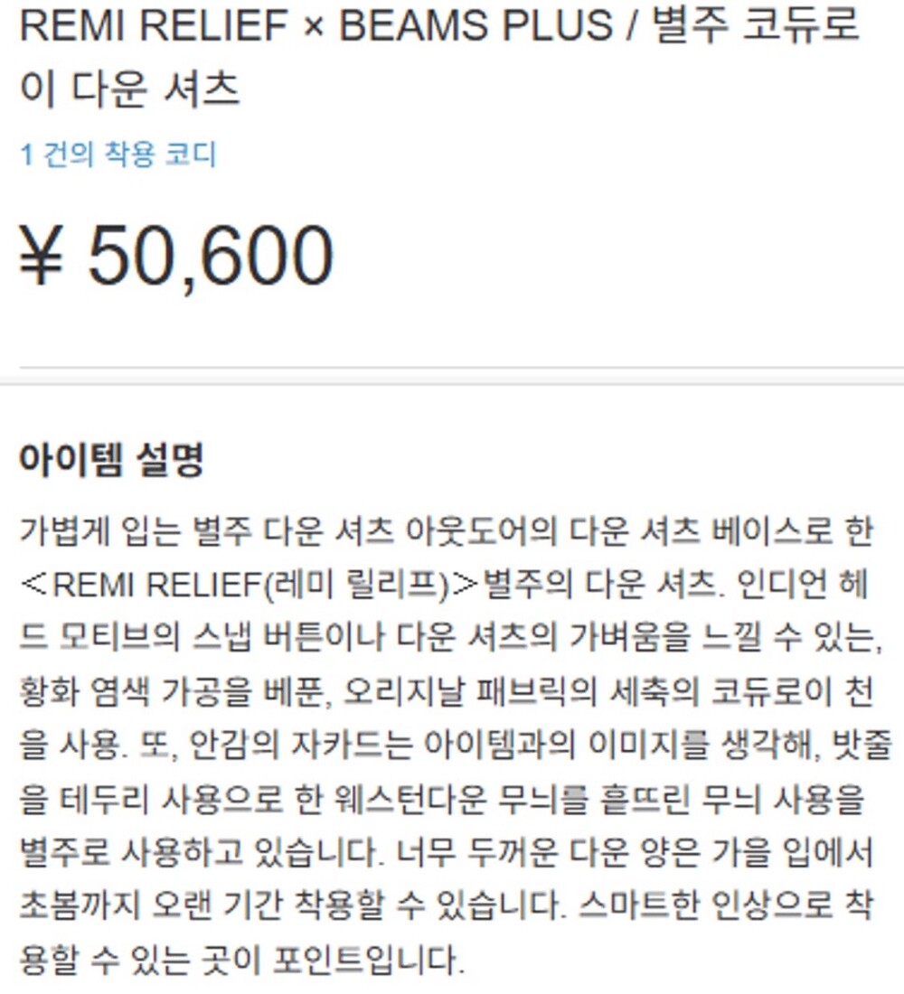 L) 레미릴리프 * 빔즈 플러스 웨스턴 다운 셔츠 자켓