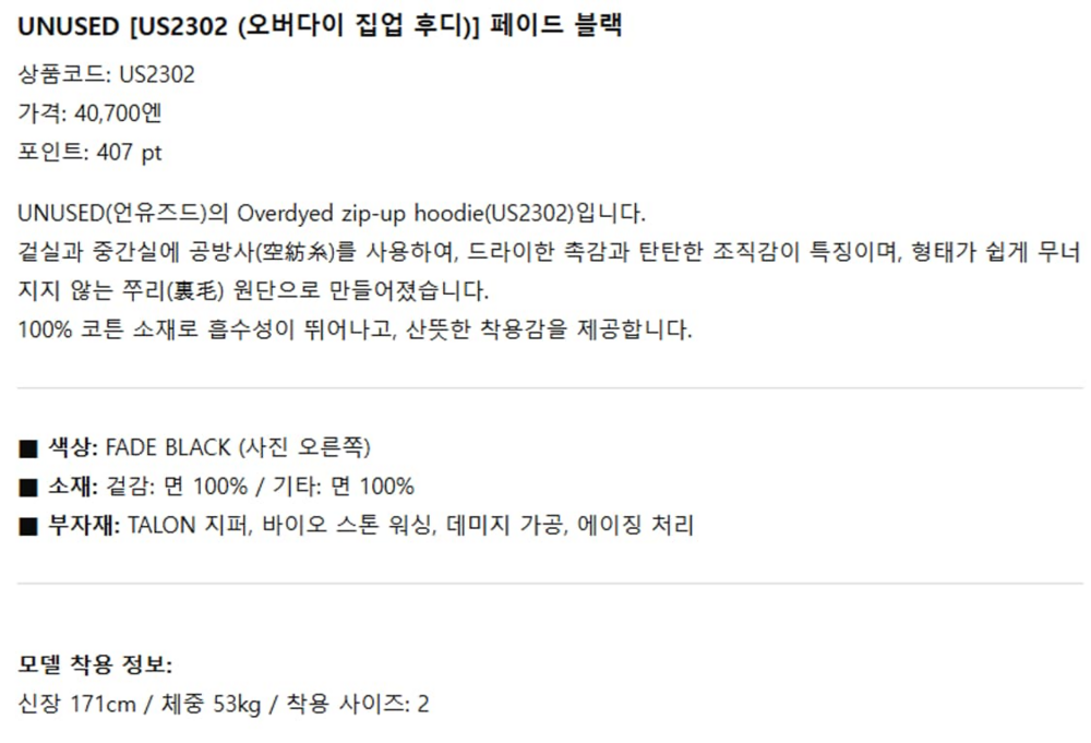 0) 언유즈드 unused 오버다이 후드 집업